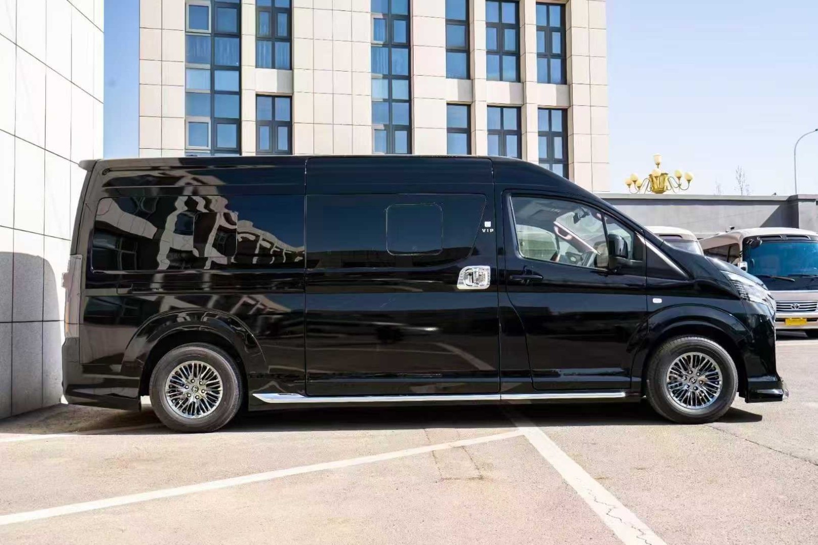 丰田海狮改装前后舱隔断,加装升降电视系统,独有的彩色倒显夜视影像系统,可以全方位提供大角度的清晰后视画面,从主动性上进一步提高了车辆的安全性能。,除了细节上精益求精,全新HIACE 也强调整体的艺术性与美感。车窗框后部支架向后倾斜,更体现简约、前卫的设计风格。深灰色保密车窗将车窗支架隐藏,使车身侧面外观保持连贯流畅,全车整体更协调自然。,丰田海狮13座自动标准版这款车是超长轴距高顶式的,长5.38米,宽1.88米,高2.28米。在商务面包车里,这款车的空间相对来说是很宽敞的,里面的座椅布局虽然是13个座位但是也不会显得很拥挤。
